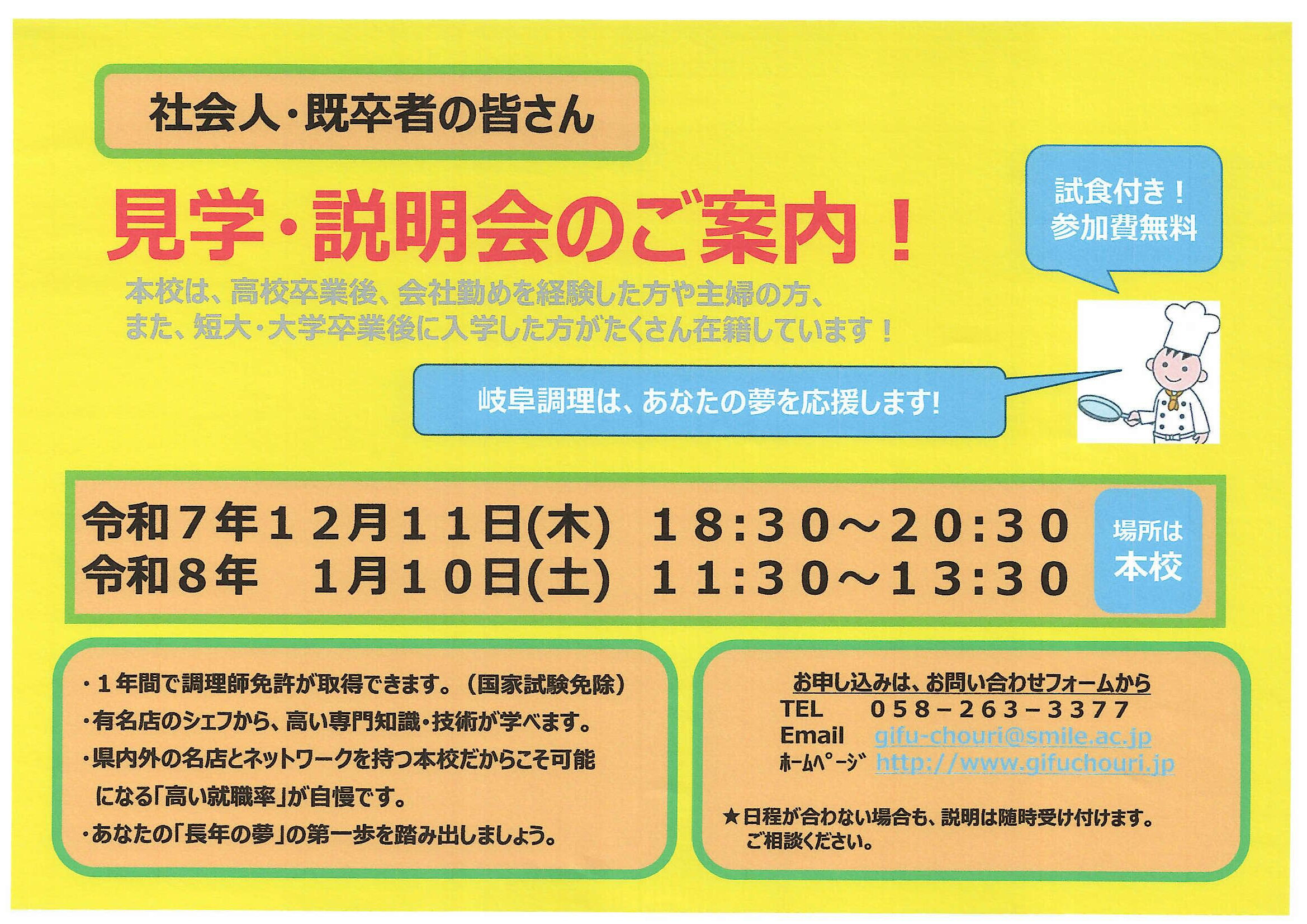 本校1年養成科には毎年、社会人の方や専門学校・大学からの入学生が多くいます。60歳を過ぎてからの入学生も珍しくありません。転職して調理師を目指す人、お店を開業したい人、地域で子ども食堂を開きたい人などいろいろな目的を持って入学し頑張っています。岐阜調理専門学校は頑張りたいあなたを応援します!